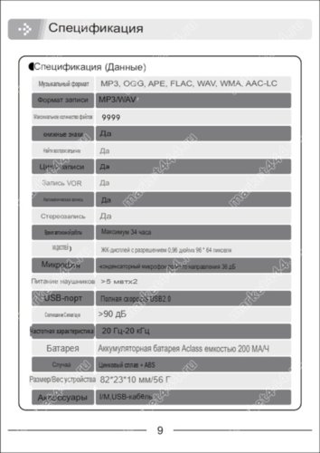 • формат воспроизведения файлов (плеер) MP3/WAV, плеер MP3/OGG/APE/FLAC/WAV/WMA/AAC-LC,